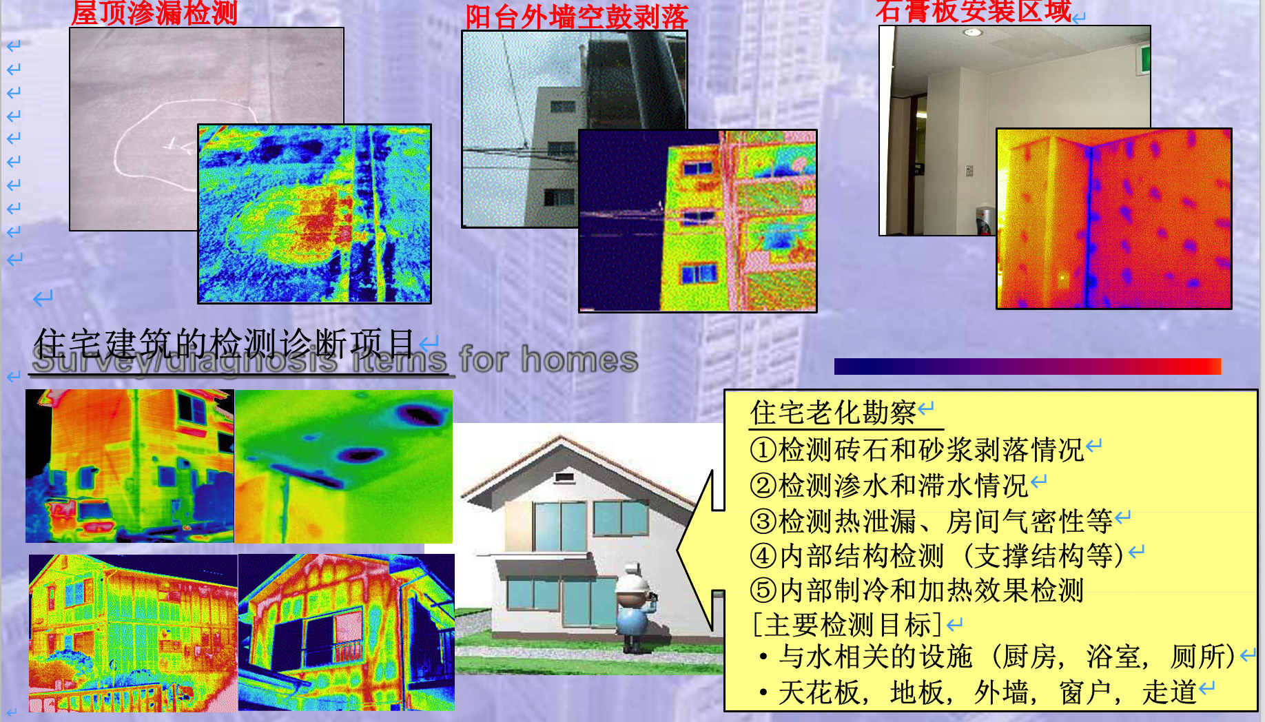 红外检测服务广泛应用于楼宇建筑的评估、维护、检测和诊断。红外检测服务是一种能将物体的温度分布可视化的设备,通过对温度的可视化,可在短时间内有效的进行“外墙饰面材料的剥落或空鼓检测”、“渗漏水或滞水检测”、“材料保温性能检测”、“房间气密性检测”、“电气设备、管道和空调的检测”等。此外,红外检测服务在楼宇建筑的“节能效果检测”手段中*为高效有用。