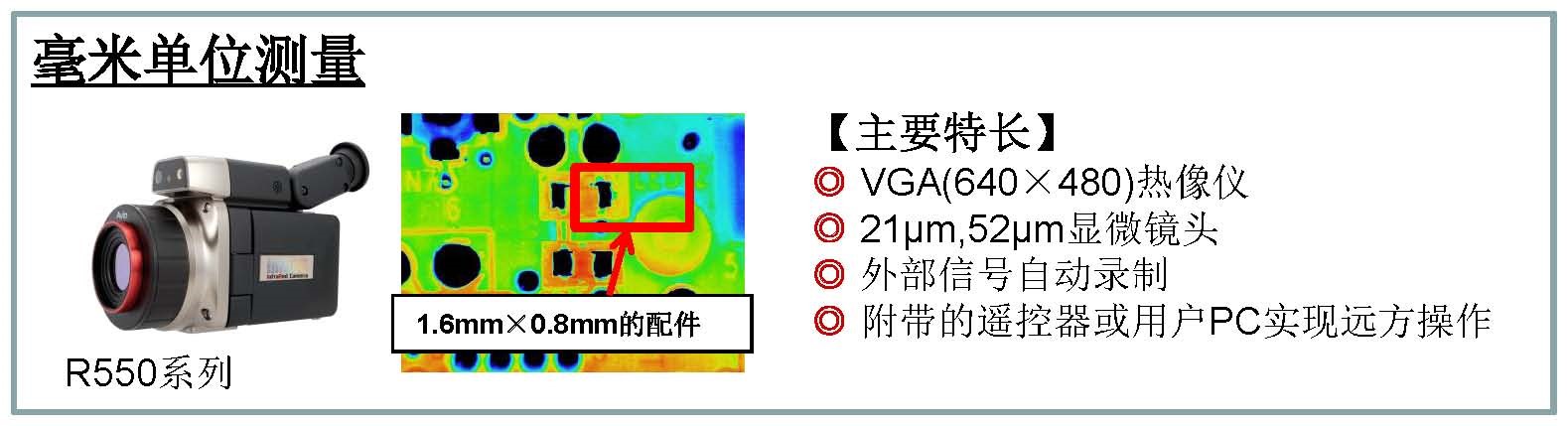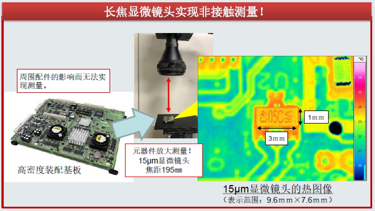 ★高分辨率显微镜头(5μm,15μm)实现热电偶无法测量的细小配件的温度分布,应用于机器的散热设计。
